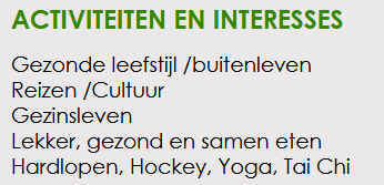 Ik beweeg me graag en gemakkelijk tussen verschillende typen mensen en ben goed in staat om mensen op hun gemak te stellen en relaties op te bouwen. Daarnaast weet ik de opgedane wetenschappelijk onderbouwde kennis goed toe te passen en merk ik dat ik daardoor cliënten goed mee kan nemen in het leefstijlcoachings-traject. Mooi om als leefstijlcoach de cliënt te mogen begeleiden naar een gezondere leefstijl. Middels de positieve benadering en wederzijds vertrouwen een gedragsverandering teweeg te brengen waar de cliënt zich prettig bij voelt en die blijvend is. Magisch als de cliënt iets nieuws gaat proberen en mij meeneemt op haar/zijn ontdekkingsreis; dat volgende stapje zet richting het beoogde einddoel.